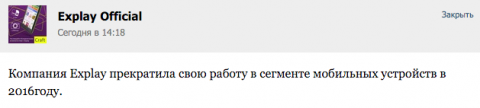 Первые слухи о том, что российская компания Explay прекратит выпуск мобильных устройств, появились ещё в прошлом году. Однако тогда производитель опроверг данную информацию, упомянув, что в компании происходит процесс реструктуризации. Сегодня в официальной группе Explay в социальной сети "ВКонтакте" появилось сообщение, которое гласит, что компания прекращает работу в сегменте мобильных устройств.