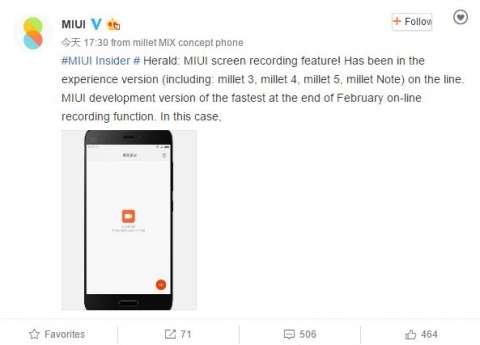 Компания Xiaomi славится тем, что не просто регулярно выпускает обновление фирменной прошивки MIUI, но и добавляет новые функции даже в минорных релизах. В своём официальном Weibo-аккаунте производитель заявил, что в конце февраля в MIUI появится функция записи видео с экрана. Новая опция войдёт в состав следующей стабильной сборки системы и прошла тестирование на Mi3, Mi4, Mi5 и Mi Note, а позже к ним присоединятся и другие смартфоны.