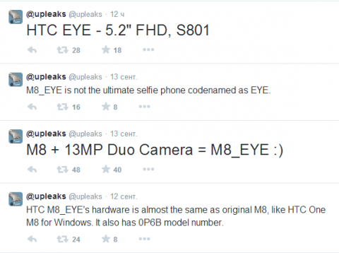 Инсайдер @upleaks продолжает делиться с нами подробностями о грядущих новинках тайваньского производителя смартфонов. В минувшее воскресенье на его странице в Twitter был опубликован ряд сообщений касательно неанонсированных "камерофонов" HTC Eye и M8 Eye.