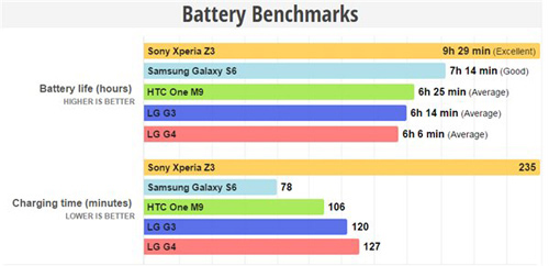 Эксперты не стали проводить хитроумные тесты и оценили лишь два показателя: время автономной работы с включенным экраном на максимальной яркости, а также время полного заряда аккумулятора. В тесте приняли участие Sony Xperia Z3 (3 100 мАч), Samsung Galaxy S6 (2 550 мАч), HTC One M9 (2 840 мАч), LG G3 и LG G4 (по 3 000 мАч).