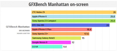 До недавнего времени самым мощным в плане графических возможностей смартфоном был iPhone 6. В бенчмарке GFXBench ему удалось обойти всех основных конкурентов, включая Galaxy S6, HTC One M9 и Galaxy Note 5. Главной причиной столь высоких показателей является достаточно мощная "начинка" и относительно небольшое разрешение дисплея. Однако у iPhone 6 появился сильный конкурент, который смог обойти его в тестах. Речь идет о ZTE Nubia Z9. Именно он показал лучший результат в графическом бенчмарке.