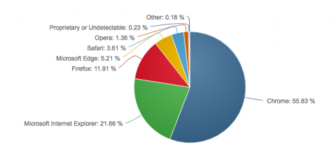 Наиболее популярным браузером остаётся Google Chrome с долей 55,83%, за ним следуют Internet Explorer с 21,66% и Mozilla Firefox с 11,91%. Ниже чем у Microsoft Edge - показатели Safari (3,61%), что можно объяснить ограниченной экосистемой, в пределах которой работает браузер. На 1,36% компьютеров используется браузер Opera.